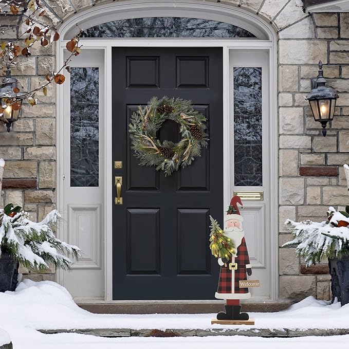 - This Santa porch sign is in a red and black plaid coat, with Christmas tree decorates with berry needles and pine cones in right hand and WELCOME sign in left hand, greet friends and festival in a classic way .The flashing LED lights are cheerful and bright at night. 9 bulbs with warm white light, 2AA batteries are needed. It's a perfect accent to place outside and near an entryway door