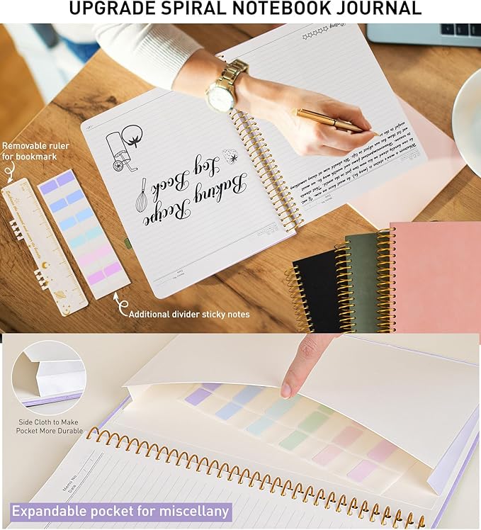 - 【Versatile and Functional spiral Journal】Our journaling notebooks features a sturdy single spiral binding helps you turn the page easily and keeps pages attached reliably. 180° lay flat design makes reading more convenient, and taking notes more efficient. Comes with an elastic closure band ensures that the notebook remains securely closed. Index labels are convenient for you to organize important note-taking notes. Built-in back pocket that is great for storing notes or other important items.