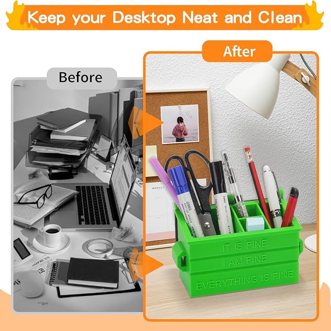 - Practical Office Desktop Decor: This quirky desk organizer is the perfect addition to any workspace. With its bright green color and unique design featuring the phrase "It is fine, I am fine, Everything is fine", it's sure to add a touch of humor and personality to your desk. The four compartments provide ample space for storing pens, pencils, and other office essentials, keeping your desk clutter-free