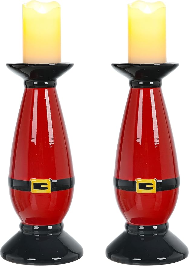 Set of 2 Christmas Hand-Painted Ceramic Large Candle Holders for Pillar Candles (Santa's Belt)