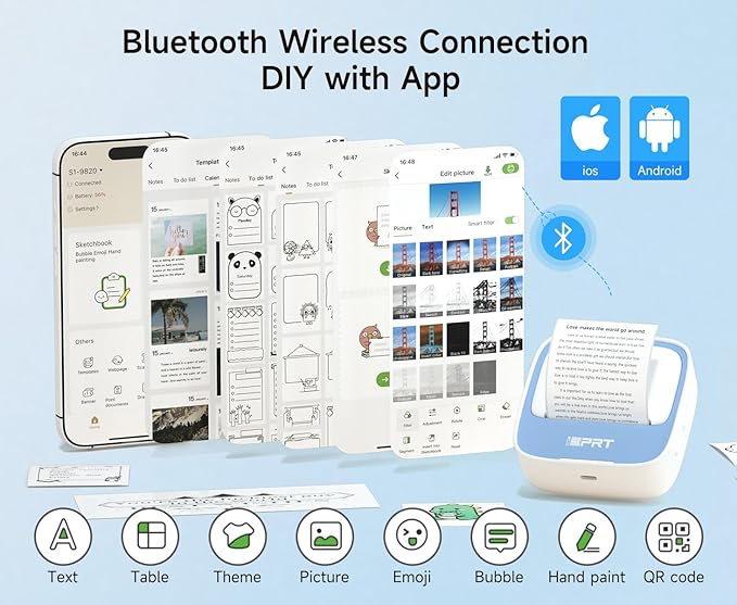 iDPRT Portable Sticker Maker Machine with 1 Roll Sticker Paper, Mini Printer Efficiently and Quickly, Thermal Printer for Study Notes, Pictures, DIY, Label, Free App with Multiple Templates,Blue