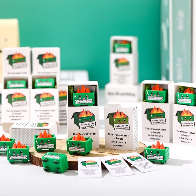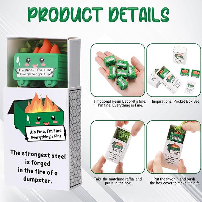 - Sufficient Quantity: you won't be disappointed with our emotional affirmation small gifts! The package includes 24 dumpster Desk ornaments Accessories, 24 gift boxes, and 24 inspirational cards with "it's fine i`m fine everything is fine"; They are very exquisite and cute with interesting puns, they're suitable for when you need to give out many tokens of appreciation or encouragement with a cute twist to bring warmth to others