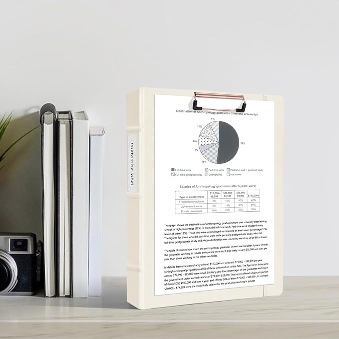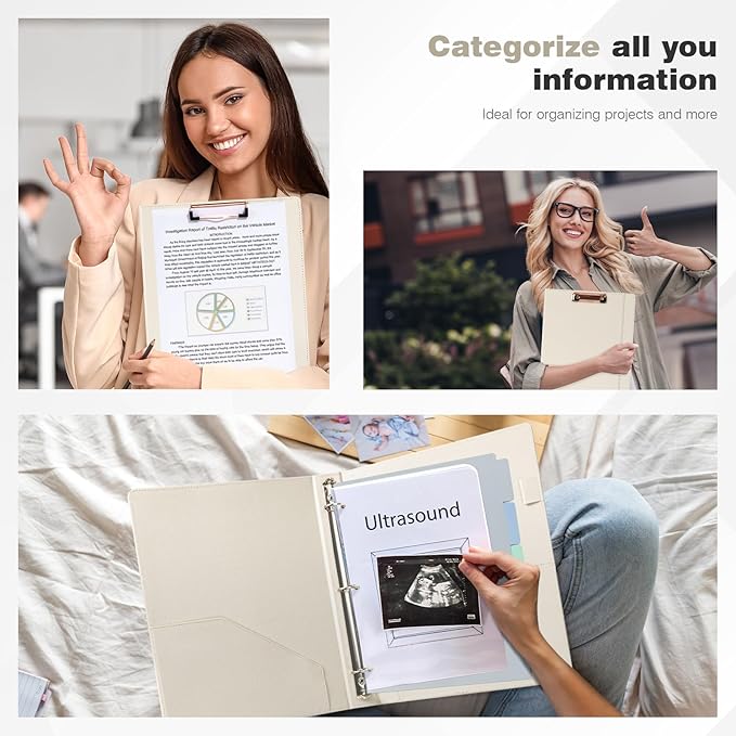- 【Versatile】1 inch sturdy round ring, can hold 200 sheets of paper securely. The interior features two pockets to store letter-sized documents and important loose papers. Also comes with a divider for 5 tabs and a sheet of stickers (the tabs fit perfectly into the divider) for easy organization. The design of the clipboard is convenient for fixing paper and taking it out for writing at any time.
