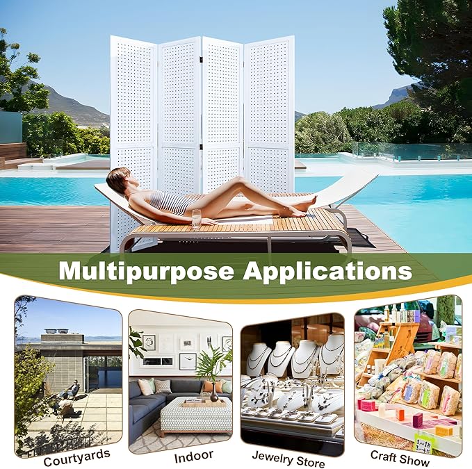 - Versatile Pegboard Panel Design:Our pegboard panel features 0.3-inch diameter holes spaced 1 inch apart, compatible with various peg hooks. This room divider doubles as a decorative folding privacy screen or wall organizer, and serves as a freestanding display panel for trade shows, craft fairs, department stores, and more.