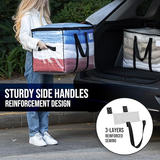 - [Durable & Heavy Duty]: Each extra large storage bags is made from PE woven material,which is waterproof and tear resistant, Different from other bags on the market, our bags use 3-layer sewing technology to deal with zipper, long carry handles, and side straps, to ensure that the bag body has sufficient load-bearing capacity and tear resistance