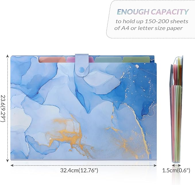 - Folder Size: 12.8'' x 9.5'' x 0.7''. This size makes it ideal for standard, letter-sized sheets of paper. Fix maximum 150-200 pages. Sturdy and Portable.
