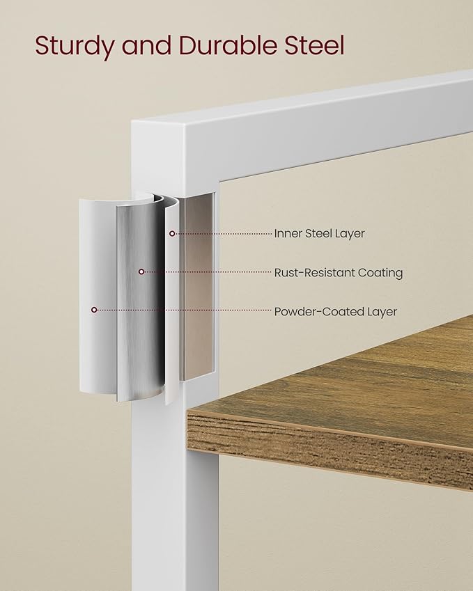 - Embrace an Industrial Vibe: The honey brown shelves paired with a white steel frame create a stylish industrial look, allowing this freestanding shelf to fit seamlessly in with your home decor and give your space an instant update
