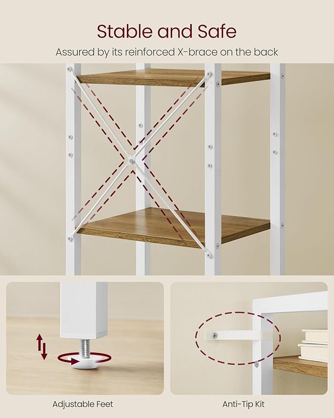 - Stable and Safe: X-brace reinforces the structure, adjustable feet keep this tall book shelf balanced on slightly uneven floors, and the included anti-tip kit will help you fix it to the wall for greater stability and safety
