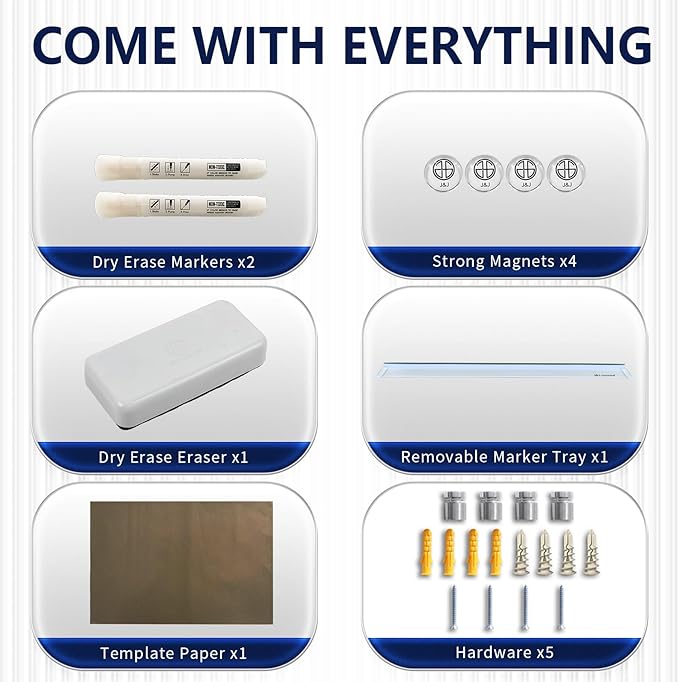 - 【Accessories Included】 The package includes 1 marker, 4 magnets, 1 eraser, 1 removable aluminium marker tray, and 1 template paper for mounting. One-stop shopping. It's a great gift idea for your workmate, boss or spouse which can enhance the office/ home wall