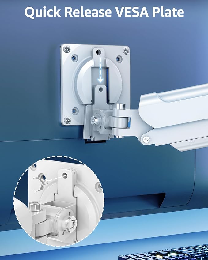 - Special Designs: Compared to a computer monitor stand with the normal VESA plate, our single monitor arm uses quick release VESA plate. It can easily lock the monitor. No gaps, no wobbling. Otherwise, the lower arm can conveniently store Allen Keys for your future use.