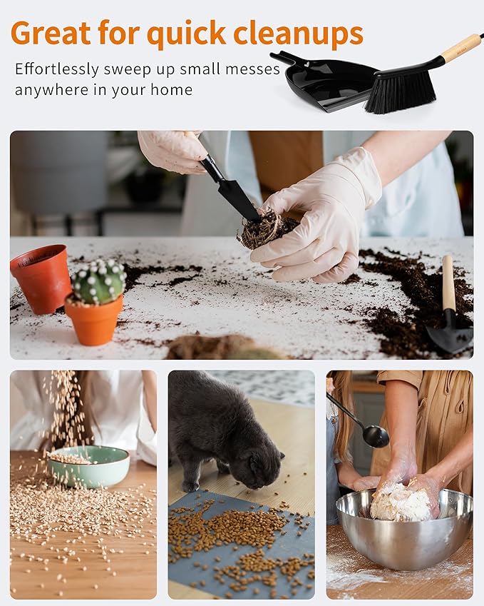- This all purpose brush and dustpan set is your great household assistant, ideal for cleaning debris from couch, furniture, countertop, it also works effectively on bed sheet, car interior or any surface that needs a helping hand.