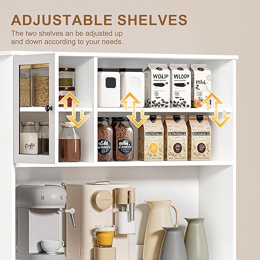 - 【Kitchen Storage Cabinet】The freestanding kitchen hutch with microwave worktop, drawers, glass cabinet door storage and open adjustable storage shelves ensures that every user has enough space to store their essentials, as well as dividers that can be adjusted to suit their needs.