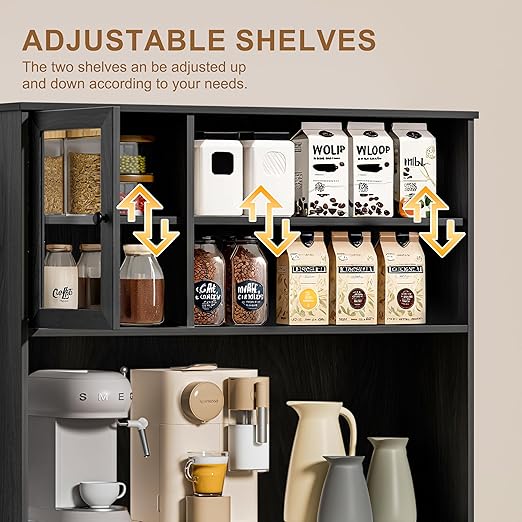 - 【Kitchen Storage Cabinet】The freestanding kitchen hutch with microwave worktop, drawers, glass cabinet door storage and open adjustable storage shelves ensures that every user has enough space to store their essentials, as well as dividers that can be adjusted to suit their needs.