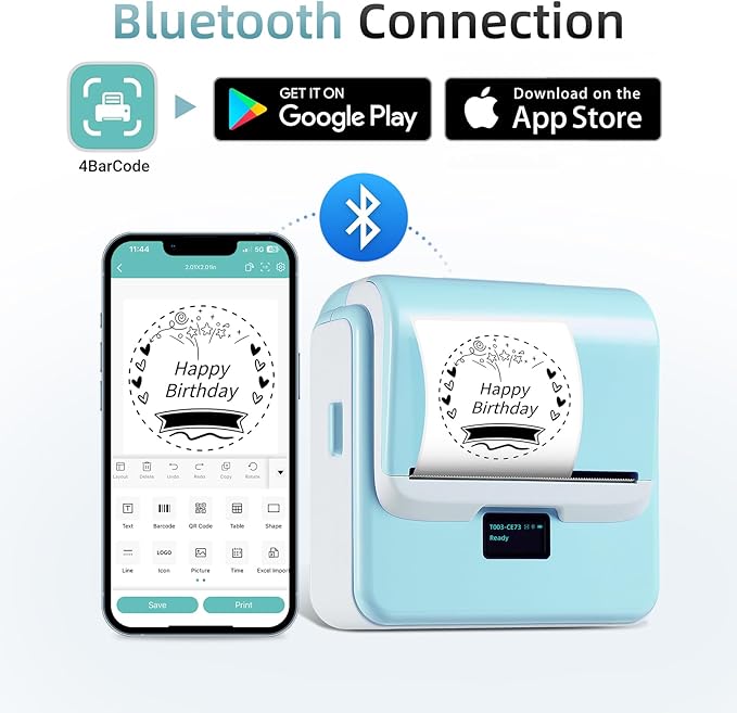 - Powerful App: With Bluetooth connectivity, you can use the free 4Barcode app, which offers over 150 ready-to-use label templates to boost your efficiency; You can also design and save your own templates with access to 80+ fonts and 670+ icons; The app supports a variety of features, including QR codes, barcode labels, tables, materials, timestamps, numbers, text, icons, and more, enabling fully customized label creation