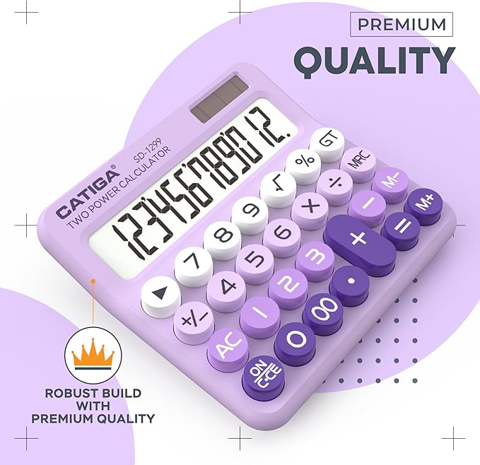 CATIGA Mechanical Switch Calculator with Solar and Battery Dual Power, 12-Digit Large LCD Display, Aesthetic and Cute Desktop Calculator with Big Button, for Home, School and Office Use, SD-1299