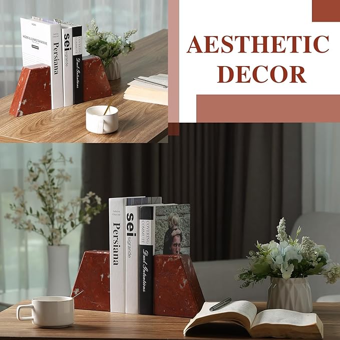 Koville Marble Bookends for Shelves, Large Bookends for Heavy Books, Non-Slip Heavy Duty Book Stopper for CD/Movies, Aesthetic Decorative Book Ends for Bookshelf Table Home Decor(Red)