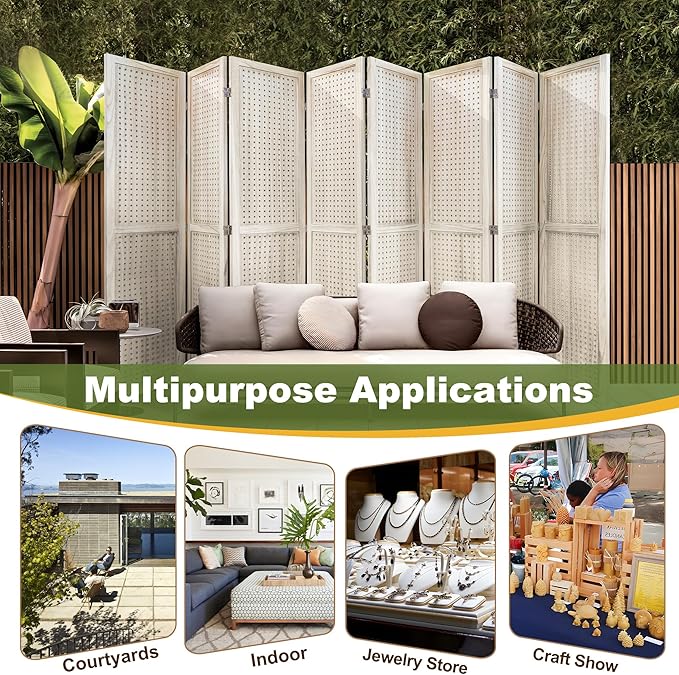 - Versatile Pegboard Panel Design: Our pegboard panel features 0.3-inch diameter holes spaced 1 inch apart, compatible with various peg hooks. This room divider doubles as a decorative folding privacy screen or wall organizer and is a freestanding display panel for trade shows, craft fairs, department stores, and more.