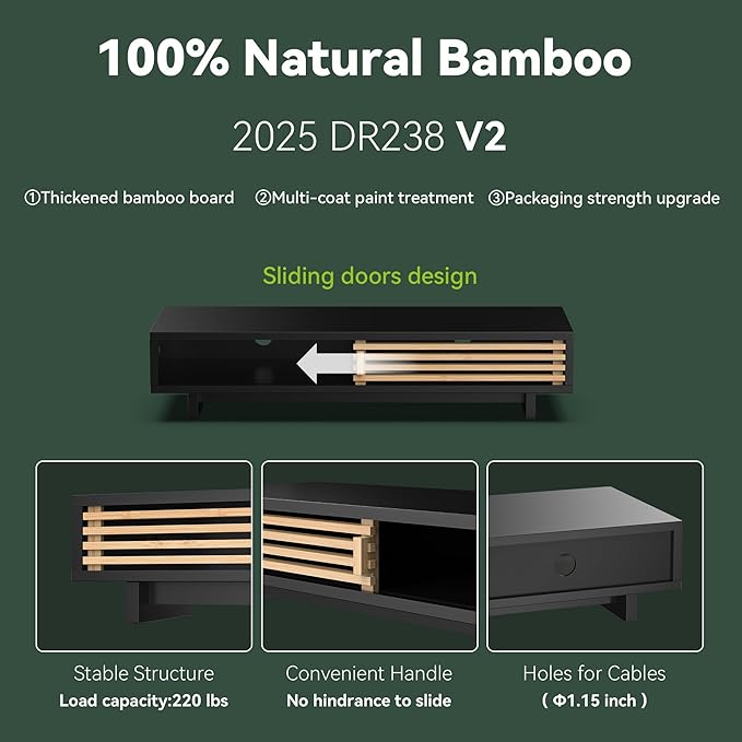 Monitor Stand Riser with Sliding Door, Computer Laptop Stand Desk Shelf Organizer with Storage (Black + Natural Bamboo, 25 Inch)