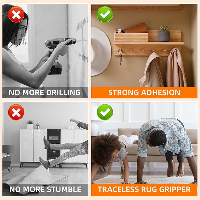 - 【Widely Versatile Use】- This clear double sided tape could stick to almost any smooth surface, like Household living room, bedroom, kitchen, toilet. You could use it to fix or stick items, such as carpets, photos, frames, wall stickers, posters, hooks, phone holders, power outlets, decorations.