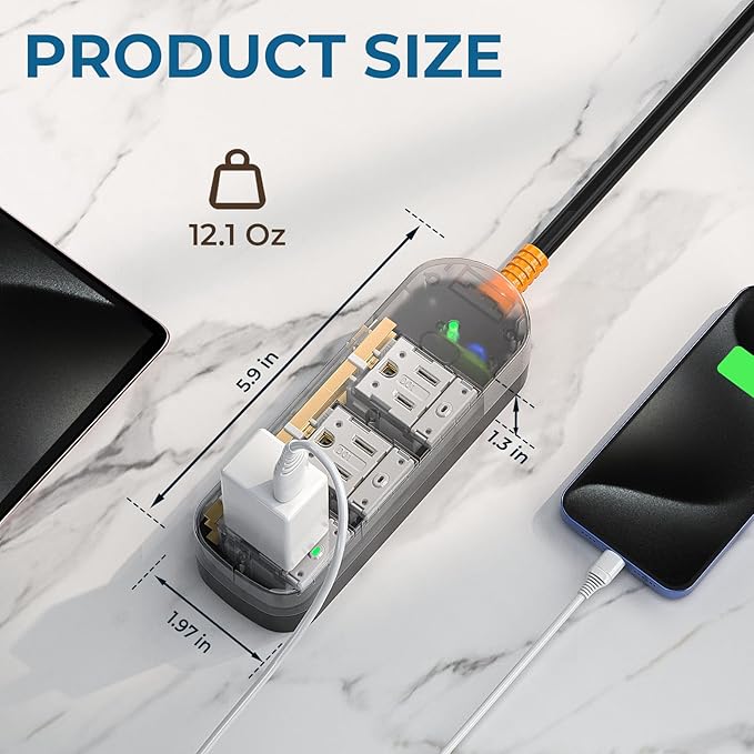 - Surge Protector power strip+Transparent Design: Surge Protector Receptacle protects your appliances from lightning storms or spikes in current. With transparent design, you can clearly see the sturdy internal components of this outlet, applying PBT extra hard material, H65 brass, C5191 Phosphor Bronze modular mounting pads, and environmentally friendly flame-retardant PC shells with a flame retardant rating of 1385°F, so it is more durable, and you can feel safe to use it!