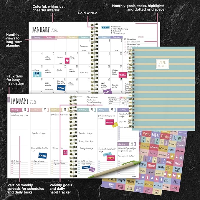 - Make Every Day Good: This medium monthly calendar planner is made for productivity! Featuring a striped front cover design, you’ll be motivated to organize. With prompts for planning and self reflection, let it encourage you to have your best year!