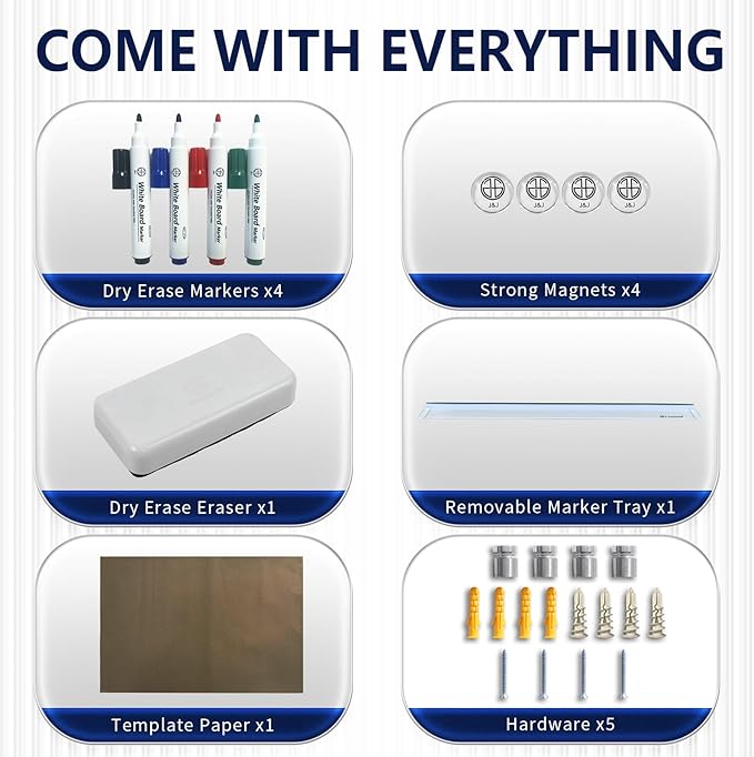 - 【Accessories Included】 The package includes 4 dry erase markers, 4 magnets and 1 glass whiteboard eraser, 1 removable aluminium marker tray, and 1 template paper for mounting. One-stop shopping. It's a great gift idea for your workmate, boss or spouse which can enhance the office/ house wall.