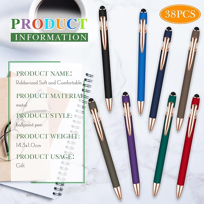Zonon 38 Pieces Rubberized Ballpoint Pen with Stylus Tip Stylish Metal Pen Capacitive Styli with Soft Rubberized Grip, Black Ink for Most Devices(Classic Colors)
