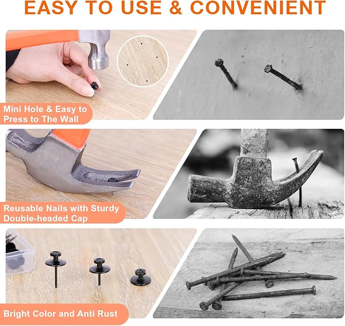 - THUMBTACKS FOR STABLE STRUCTURE: The picture hanging kit are designed with double heads, and the second head provides strong support for the nails for hanging pictures, making it easier to hang heavier objects on the wall without slipping or falling off. Each wall nails for hanging can safely support up to five pounds.