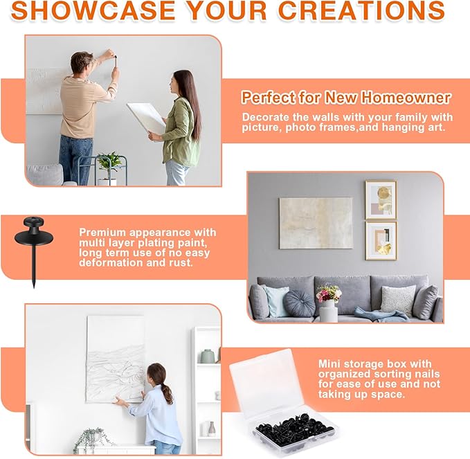 - 50 PCS PICTURE HANGERS: This package contains 50 thumb tacks, along with an easy-to-store transparent box. You can easily pick out the wall hangers without nails every time you use them. You don't need to worry about losing or misplacing them