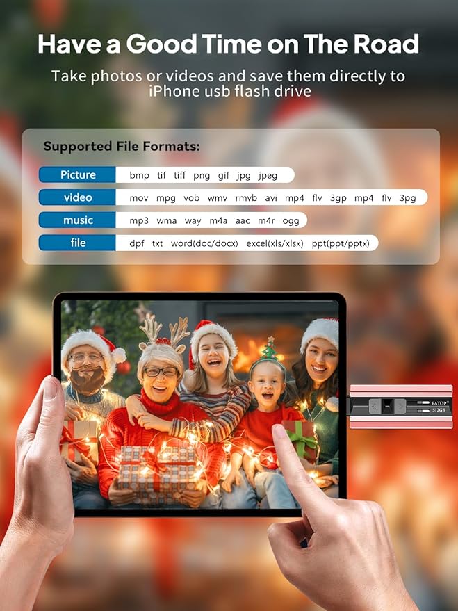 - 【Watch Movies, Photos and Play Music Directly From Phone Flash Drive】Store your favorite videos, audios and music on your Phone's Photo Stick, then seamlessly plug and play on your Phone or Tablet anytime, anywhere. No more need for Internet or WiFi.This Phone storage device plays videos in many different formats.Pictures stored on the Phone storage device also support different formats. Great way to store all your pictures and videos on an phone external storage device.