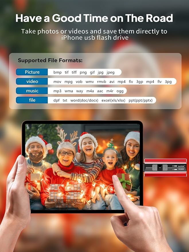 - 【Watch Movies, Photos and Play Music Directly From Phone Flash Drive】Store your favorite videos, audios and musics on your iPhone's Photo Stick, then seamlessly plug and play on your iPhone or iPad anytime, anywhere. No more need for Internet or WiFi.This iPhone storage device plays videos in many different formats.Pictures stored on the Phone storage device also support different formats. Great way to store all your pictures and videos on an phone external storage device.