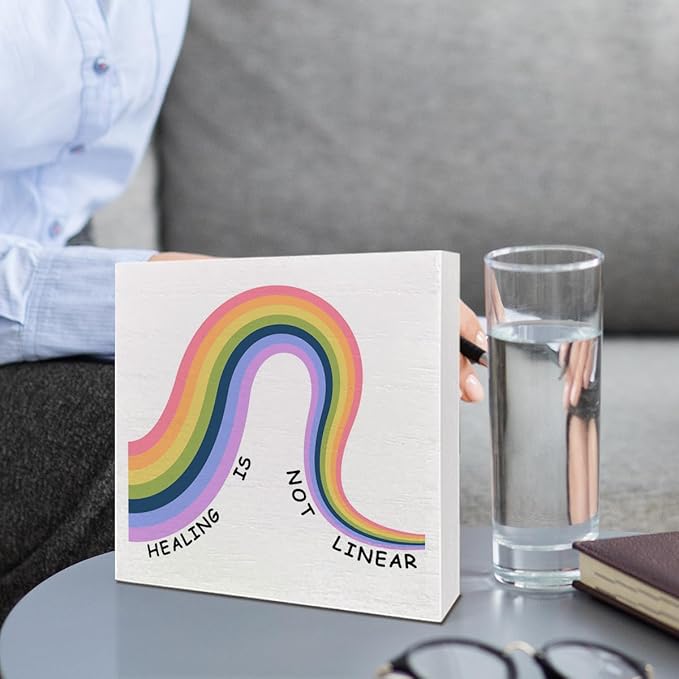 Therapy Office Desk Wooden Box Sign Decor, Mental Health Wood Box Sign Decorations for School Psychologist Therapy Office, Gifts for Therapist Psychologist School Counselor, Healing Is Not Linear