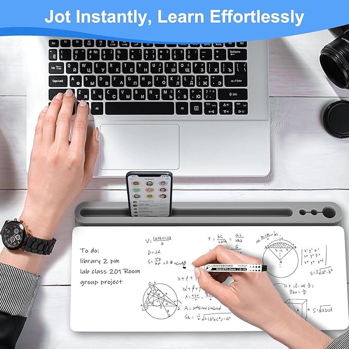 - Multiple Functions - To enhance the overall convenience of the product, this whiteboard includes 1 large pen holder, 2 small pen holders and 1 slot on the top which can hold 3 markers, a tablet and a phone. Equipped with charging port notch in the slot, the desk board is a good option to realize office charging, and you can charge your phone quickly. This dry erase board is more ergonomic with the perfect ramp design and non-slip design, which can make itself be used as keyboard pad.