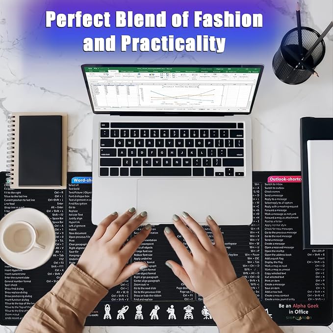 - 【Easy to clean】No worry about the spills of water,tea,coffee on this Excel/word/power point/ outlook/ windows Cheat Sheet Desk Pad,the spill-repellent surface makes it easy to clean up by using a rag or pieces of napkins, saving you time and will focus on your work.