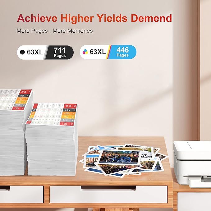 - 【High Page Yield】Up to 711 pages per 63 XL black ink cartridge & 446 pages per 63 XL color ink cartridge (At 5% coverage, A4 paper)
