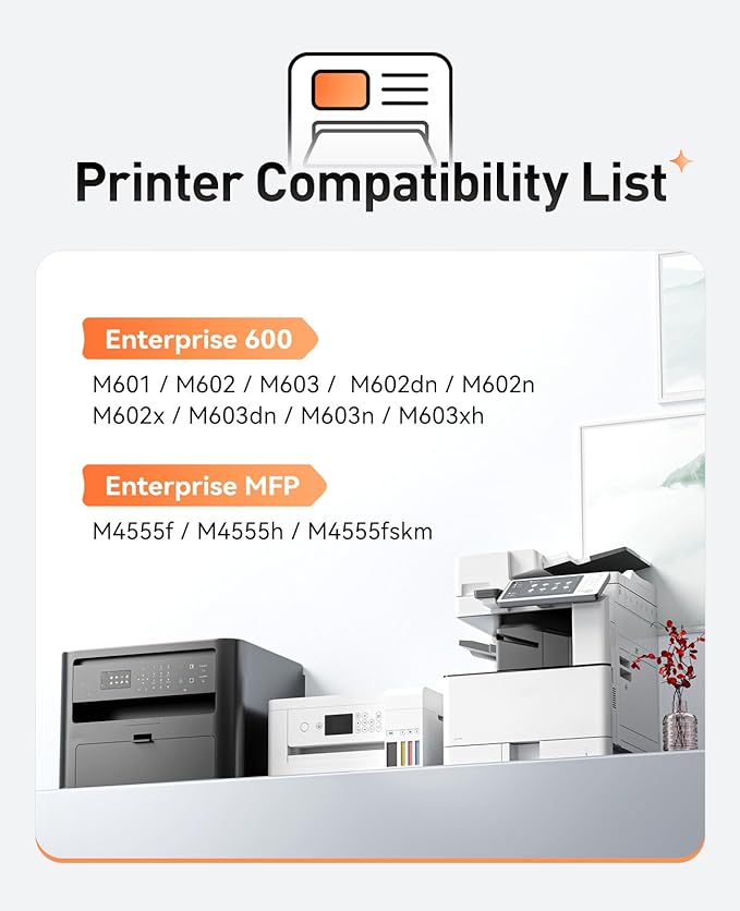 - Compatible Printer: Compatible with HP LaserJet Enterprise 600 M601 M602 M603 Printer M602dn, M602n, M602x, M603dn, M603n, M603xh; HP LaserJet Enterprise M4555f MFP, M4555fskm MFP, M4555h MFP,M4555 MFP Series Printer.