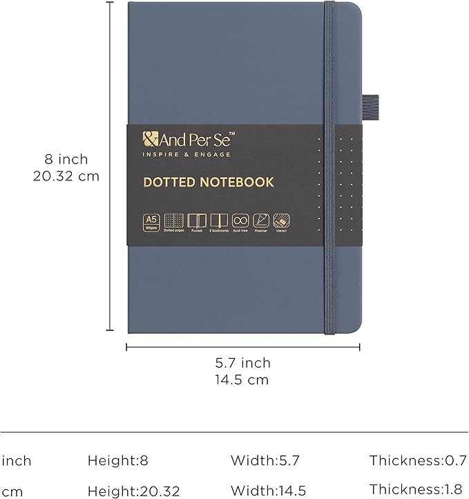 &And Per Se Bullet Dotted Journal Notebook, A5 Leather Hardcover, 176 Numbered Pages 100GSM Thick Dotted Paper, 2 Sheets of Stencils Included - 5.7'' x 8'' (Dark Blue)