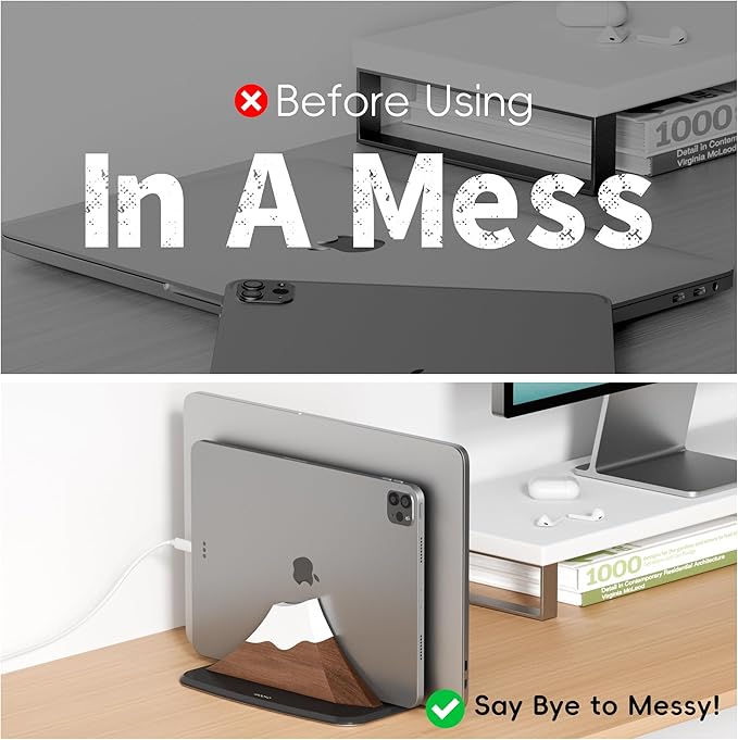 - Dual-Slot Vertical Design:This laptop stand features a dual-slot vertical design, allowing you to store two laptops upright simultaneously. By maximizing vertical space, it significantly reduces desk clutter compared to traditional horizontal stands. Perfect for home or office use, this design keeps your workspace organized, efficient, and visually tidy, while offering enhanced space utilization for a cleaner, more productive environment.