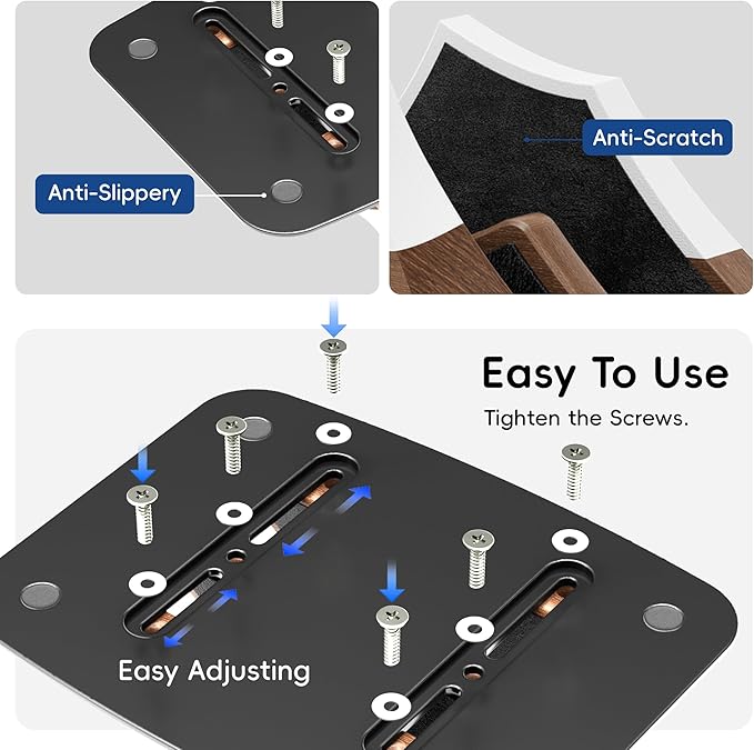 - Easy to Install:Installing this laptop stand is straightforward and quick. Simply follow the instructions to tighten the screws on the base and wooden legs, and adjust the movable slots. No complex tools or cumbersome steps are required, making assembly easy and efficient. This simple installation process saves you time and hassle, allowing you to focus on enhancing your productivity.