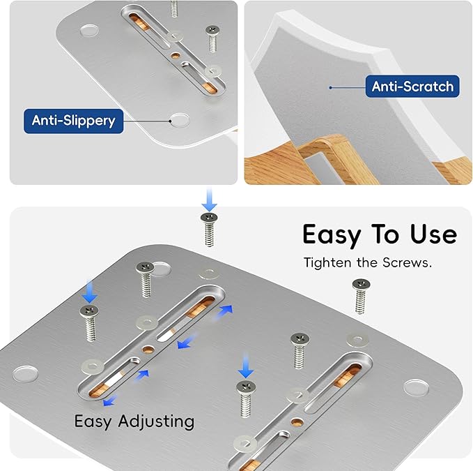 - Easy to Install:Installing this laptop stand is straightforward and quick. Simply follow the instructions to tighten the screws on the base and wooden legs, and adjust the movable slots. No complex tools or cumbersome steps are required, making assembly easy and efficient. This simple installation process saves you time and hassle, allowing you to focus on enhancing your productivity.
