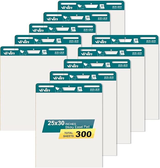 ViVin Super Sticky Easel Pad, 25 x 30 Inches Flip Chart Paper for Teachers, Large Self Stick Easel Paper, Teacher Anchor Chart, 30 Sheets/Pad, 10 Pads/Pack
