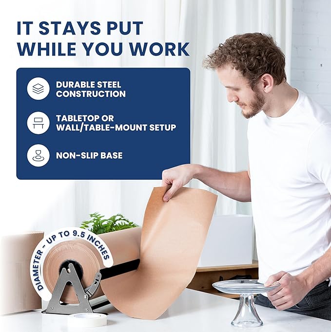 - Roll Compatibility: Fits rolls up to 24'' wide, max 9'' diameter (equivalent to 1000ft on a 1'' core). Be sure to insert your paper with the loose end over the top; butcher paper, construction paper, brown paper, or craft paper may be used