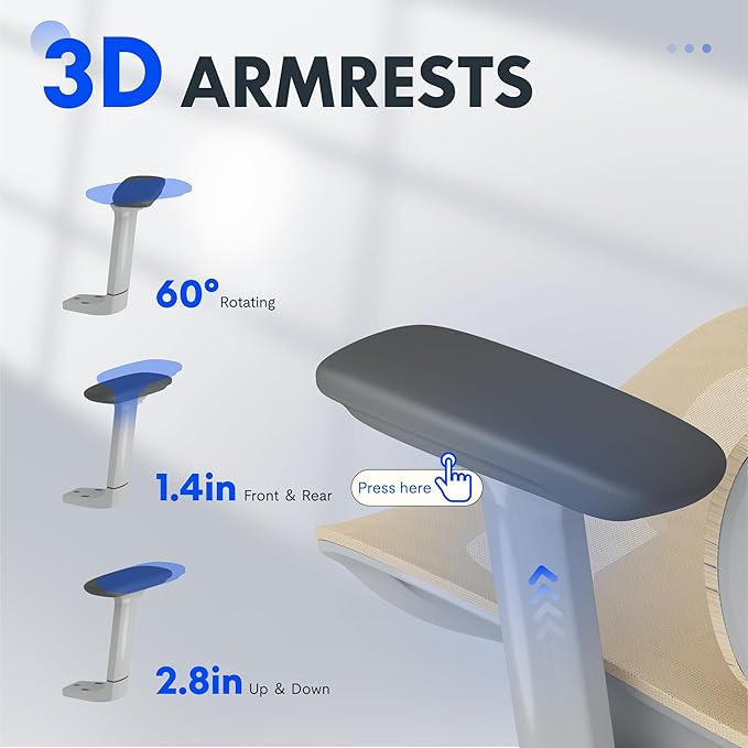 - 3D Armrests: Fully adjustable armrests (height, forward/back, and swivel) allow for precise positioning to reduce arm strain during extended use.