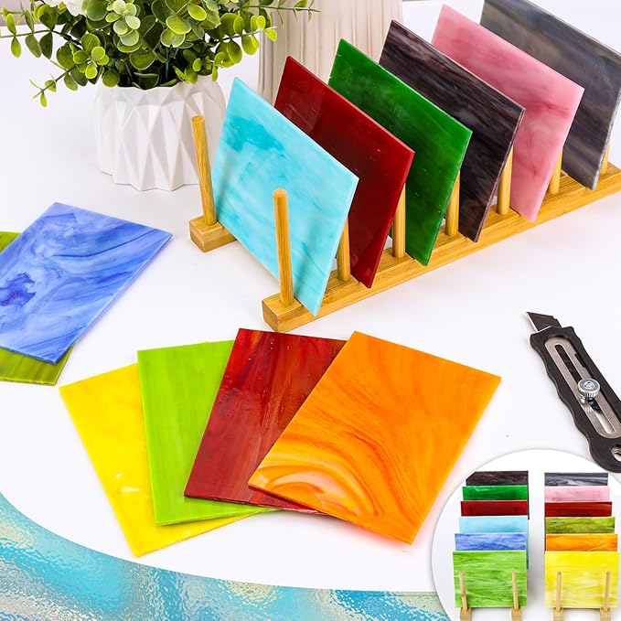 - Opaque Stained Glass Sheets: you will 12 pieces of stained glass kits for beginners, in transparent or opaque style; The colors include red, yellow, blue, green, pink, black and white, etc. Each color will not be repeated; The lines and textures on it will also vary; Sufficient quantity and rich colors can meet your various application needs and combination needs. Each glass sheet is packed in soft foam to prevent damage during transportation, ensuring the safe delivery of a complete and intact set of stained glass sheets