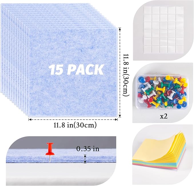 - Easy Installation & Safe Removal:Our ready-to-use kit includes 12 or 15 high-density felt pin boards (11.8"x11.8"/30x30 cm, 0.35" thick) and double-sided safe-to-remove tape for hassle-free mounting. Each set comes beautifully packaged, making it a perfect gift. Plus, we’ve included 2 boxes of push pins and 1 sticky note pad for added convenience.