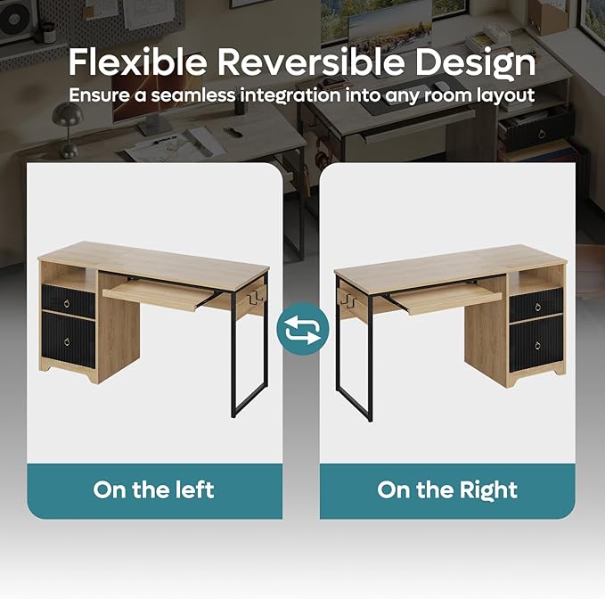 - User-Friendly Design: The home office desk features a flexible keyboard tray for comfortable typing. Its reversible pedestal can be installed on either the left or right side, ensuring seamless integration into any room layout. Additionally, two practical hooks provide convenient storage for headphones or other accessories