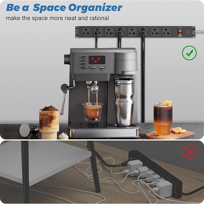 - ✔POWER STRIPS WITH SURGE PROTECTION: Features 1200J surge protector and a 20A circuit breaker, providing a reliable power supply for devices while preventing short circuits, overcurrent, overheating, and overvoltage. If the current exceeds 20A, the circuit breaker automatically cuts off power to prevent damage. After powering off, simply reset by turning off the power and pressing the reset switch.