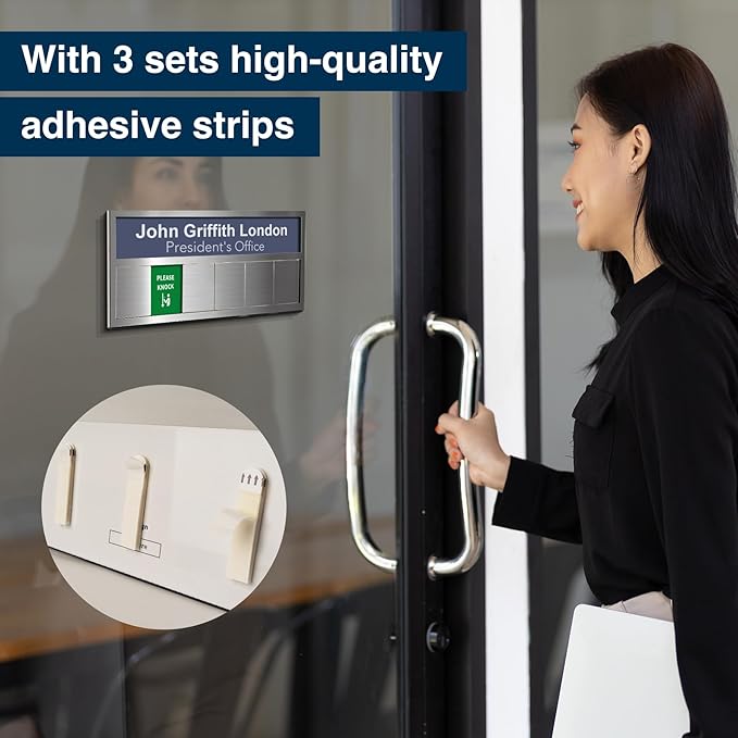 - Versatile Installation: Adjustable stand for desk display with anti-slip strips, plus adhesive strips for easy, residue-free door mounting. Perfect as a desk nameplate or office door sign.