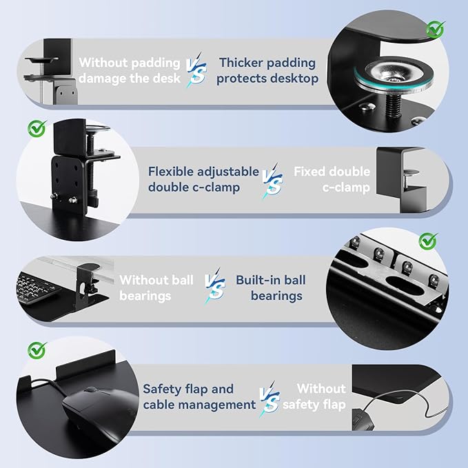 - 【SMOOTH GLIDE & ROCK-SOLID STABILITY】Built with premium ball bearings, our tray glides effortlessly and quietly. The heavy-duty steel brackets and non-slip pads ensure maximum stability, supporting up to 33 lbs. Plus, the safety flap and cable management system keep your workspace organized and secure