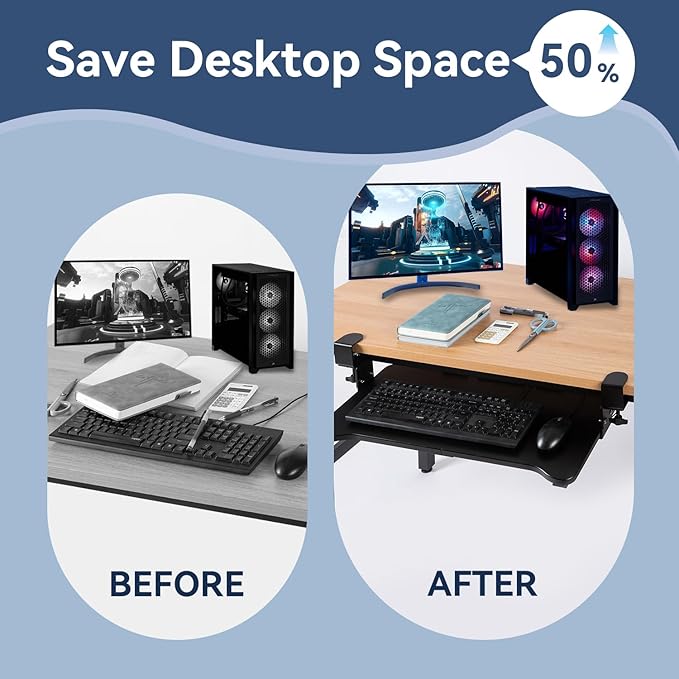 - 【MAXIMIZE YOUR DESK SPACE】Our 26.4” x 11.8” under-desk keyboard tray is designed to free up your workspace by neatly storing your keyboard, mouse, and accessories underneath your desk. With a total length of 31” (including clamps), it’s the perfect solution to declutter your desk and keep everything within easy reach